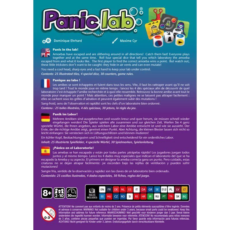 Des amibes se sont échappées et courent dans tous les sens, il faut vite les rattraper ! Les joueurs jouent tous ensemble et en même temps. Lancez les 4 dés très spéciaux qui vous indiqueront quel laboratoire a laissé s’échapper l’Amibe et à quoi elle ressemble. Le premier qui désigne la bonne amibe gagne un point. Mais attention, ces petites bêtes ne se laissent pas attraper facilement: elles se cachent sous les grilles d’aération et peuvent subir des mutations!