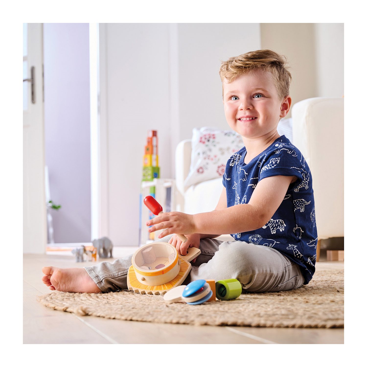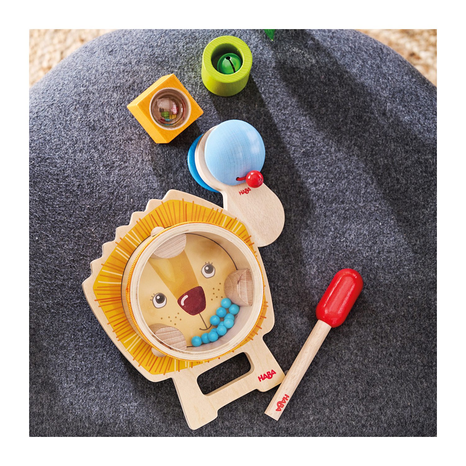 Les enfants adorent faire de la musique tout seuls ! Avec l’ensemble de jeux Léo le lion, ils pourront reproduire les sons et les rythmes les plus divers grâce au tambour-lion (avec tambour, hochet à bruit de billes et crinière à faire cliqueter), aux castagnettes et aux cubes sonores. Même les plus petits pourront aborder le monde des sons de manière ludique.
