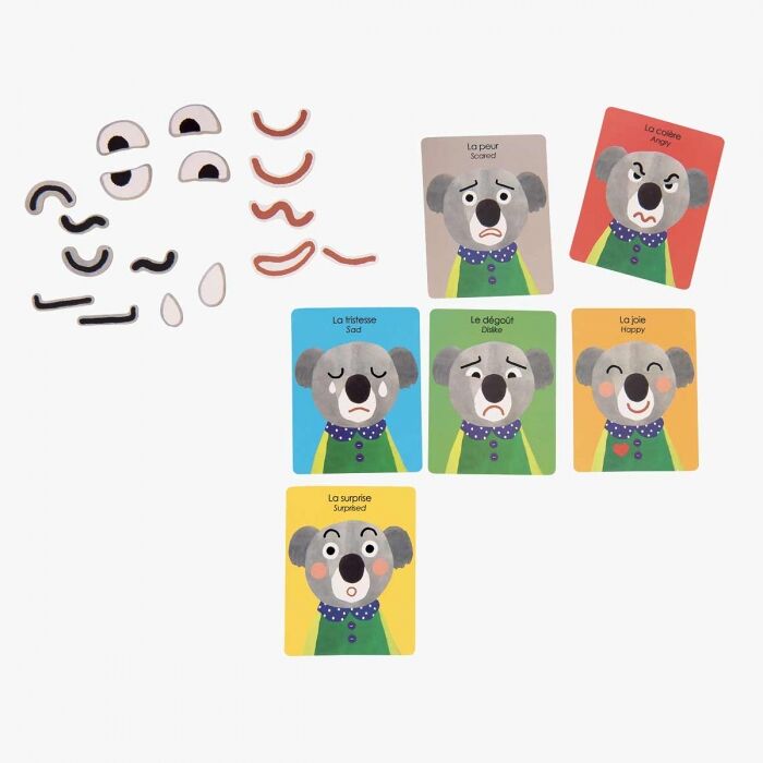 Illustrations rondes et colorées pour ce jeu 1er âge sous forme de livre-coffret aimanté. Sur un portrait de koala dessiné, on pose parmi les 25 magnets, yeux, bouche… à disposition, celles qui expriment l’expression de la carte piochée : la peur, la joie…