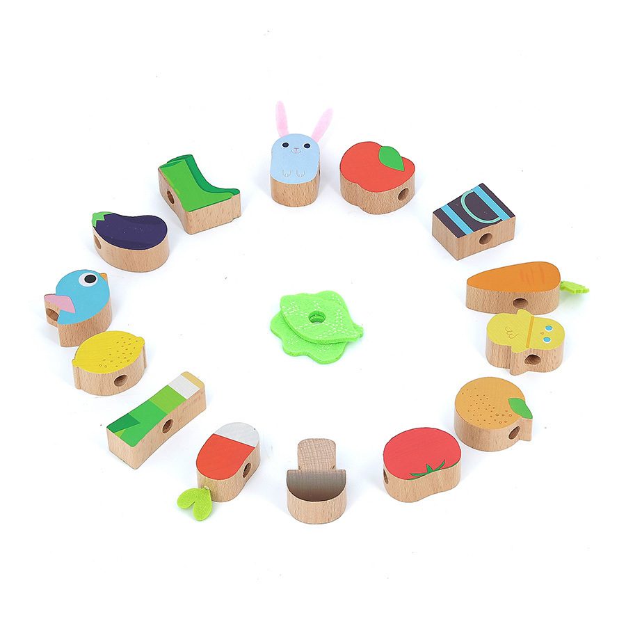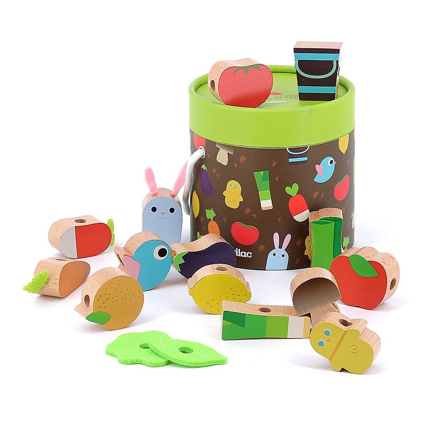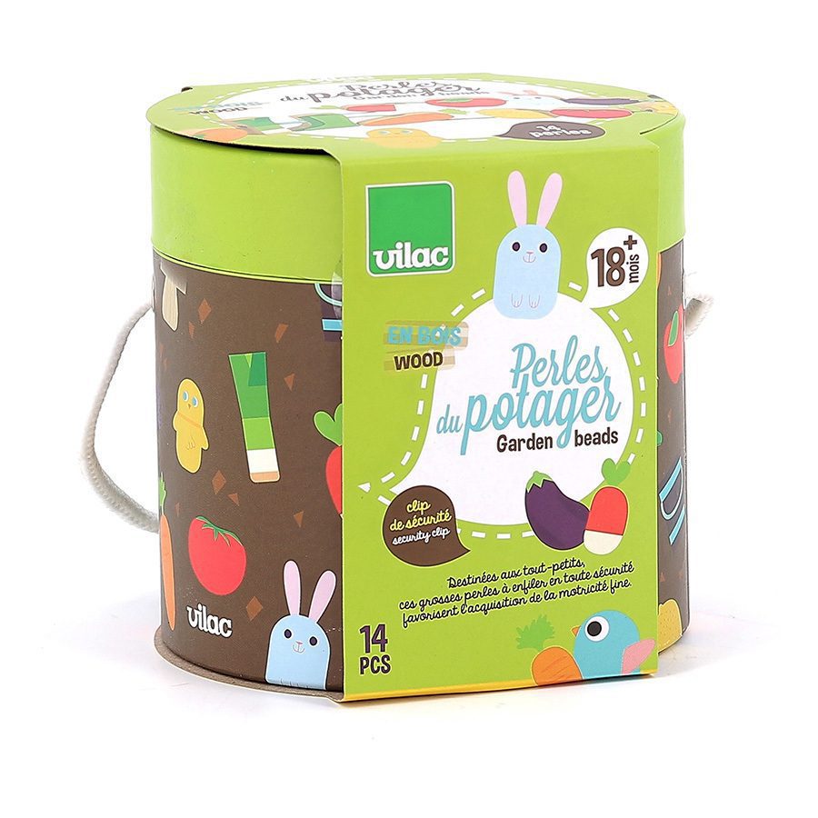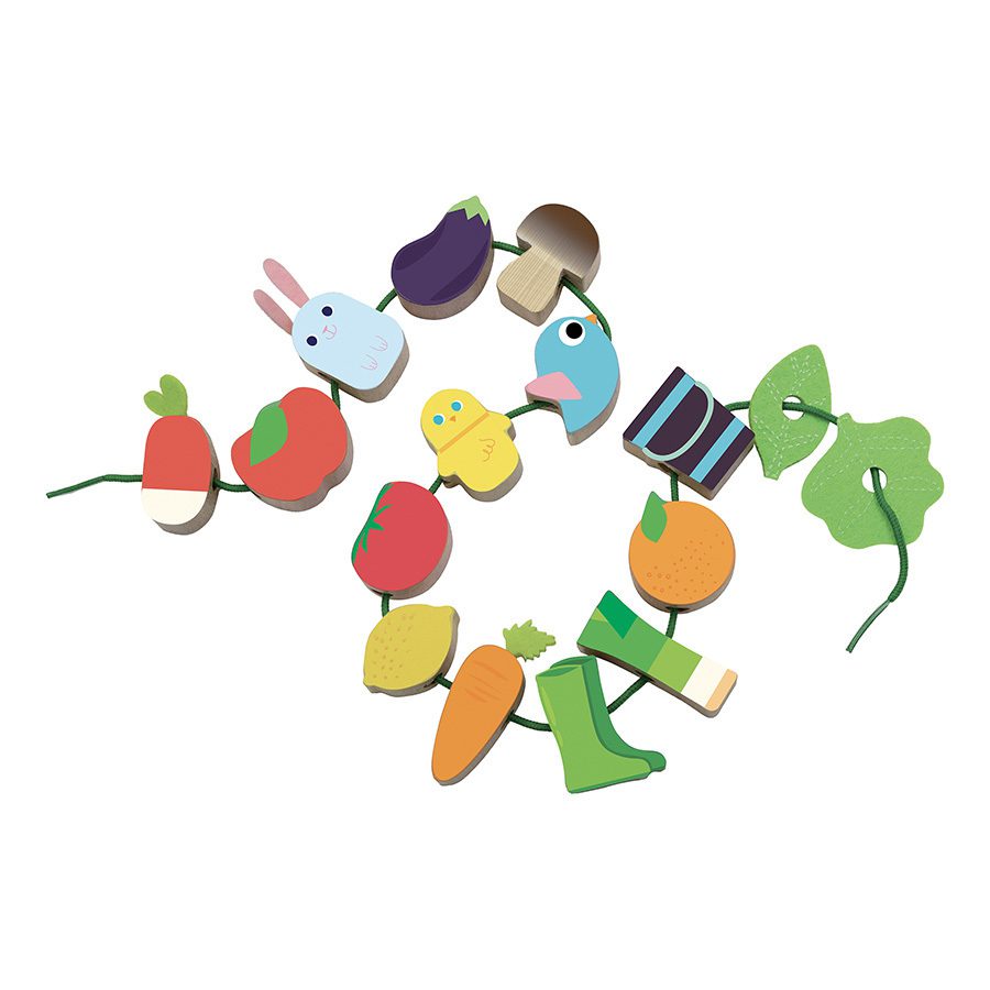 Les plus petits peuvent inventer mille et une histoires et plonger dans le monde du potager grâce aux figurines en bois : légumes, fruits, animaux de la ferme seront de parfaits compagnons de jeu. Les plus grands quant à eux pourront s’amuser avec les figurines qui vont se transformer en perles à enfiler sur le cordon de tissu. Ce dernier possède des clips de sécurité, ce qui rend ce premier jeu d’éveil adapté aux plus jeunes.