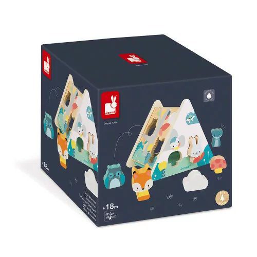 C’est l’heure de rencontrer les animaux de la forêt ! Cette jolie boîte à formes en bois dans des tons tout doux et très actuelle ravira votre tout-petit. Accessible dès 18 mois, ce jeu premier âge l’aidera à développer sa dextérité tout en s’amusant. Votre enfant apprendra, à son rythme, à manipuler les objets pour les encastrer dans les endroits correspondants. Une fois encastrées, les formes seront facilement récupérées à l’arrière du tipi. Ce jouet à encastrer en bois inclut un ourson, un lapin, un renard, un hibou, un champignon et un nuage. Pour plus de sécurité, nous avons opté pour de la peinture à l’eau, les enfants de moins de 3 ans portant régulièrement les jouets à la bouche.