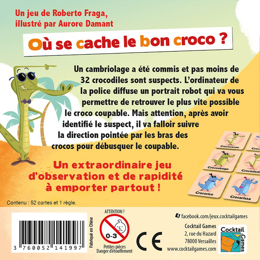 Un cambriolage a été commis et pas moins de 32 crocodiles sont suspects. L’ordinateur de la police diffuse un portrait-robot qui va vous permettre de retrouver le plus vite possible le croco coupable. Mais attention, après avoir identifié le croco suspect, il va falloir suivre la direction pointée par les bras des crocos, pour débusquer le coupable.