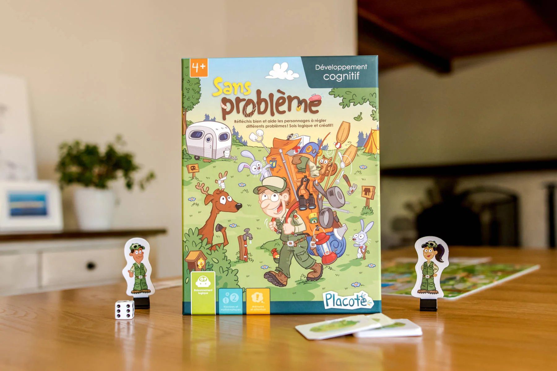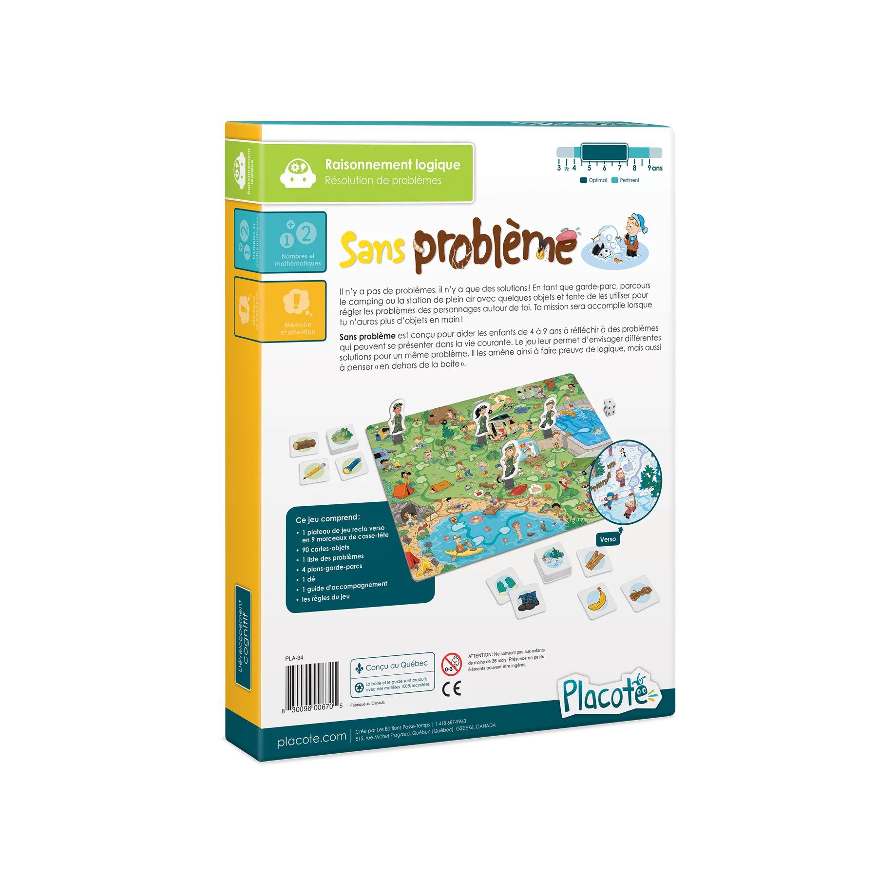 Sans problème est conçu pour aider les enfants de 4 à 9 ans à réfléchir à des problèmes qui peuvent se présenter dans la vie courante. Le jeu leur permet d’envisager différentes solutions pour un même problème. Il les amène ainsi à faire preuve de logique, mais aussi à penser « en dehors de la boite ».