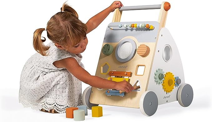 Ce joli chariot multi-activités à pousser est particulièrement adapté à l’apprentissage de la marche. Il accompagnera votre enfant en toute sécurité dès 12 mois : son frein invisible et amovible permet de bloquer les roues et de les libérer progressivement afin de maitriser la vitesse du chariot pendant l’apprentissage. En plus de la marche, votre enfant pourra tester sa motricité fine ainsi que sa dextérité avec les 9 activités ludiques proposées : boulier, boîte à formes, labyrinthe, engrenages, bouton rotatif sonore, « gratte-gratte », miroir rotatif grossissant, tambour et xylophone métal pour développer son éveil musical. Très astucieux, ce chariot d’activité est équipé d’un tapis en feutrine pour atténuer le bruit et amortir la chute des cubes. Enfin, ses roues sont silencieuses ! Si on ajoute à tout ceci, son design contemporain et ses couleurs douces, on ne peut que craquer ! On aime le bois naturel, le blanc et le gris, mis en valeur par les détails colorés des nombreuses activités de ce chariot premier âge pour bébé ! Offrir un chariot de marche multi-activités en bois à bébé, c’est lui proposer un jouet deux en un robuste et plein de charme. Un jouet intemporel qui pourra se transmettre de génération en génération, et qui fera craquer toute la famille ! La collection Sweet Cocoon, ce sont des jouets premier âge aux couleurs douces, aux formes arrondies, proposant des activités de découvertes amusantes pour bébé !
