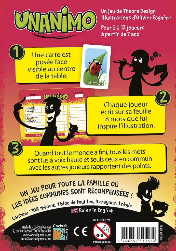 Avis de l’expert Unanimo sollicite l’observation et l’analyse visuelle d’éléments représentés sur des cartes. Il développe le langage en sollictant l’accès lexical ainsi que la connaissance de synonymes des joueurs. Ils enrichissent leur vocabulaire et s’entrainent à l’écriture. Ce jeu demande aux joueurs de réussir à se mettre à la place des autres en se décentrant. Le but étant d’avoir écrit le plus de mots communs sur huit propositions quant à ce que nous inspire l’image sur la carte. Ainsi, Unanimo stimule la capacité à évalUer différentes possibilités en développant la pensée critique et la prise de décision. Les joueurs doivent se rappeler des réponses données par les autres participants pour faire des choix pertinents et mieux évaluer ce que ceux-ci pourrait écrire au sujet d’une carte. Cela solicite leur mémoire à court terme et renforce la capacité à retenir des informations. Le jeu leur permet par la même occasion d’améliorer mémoire et concentration.